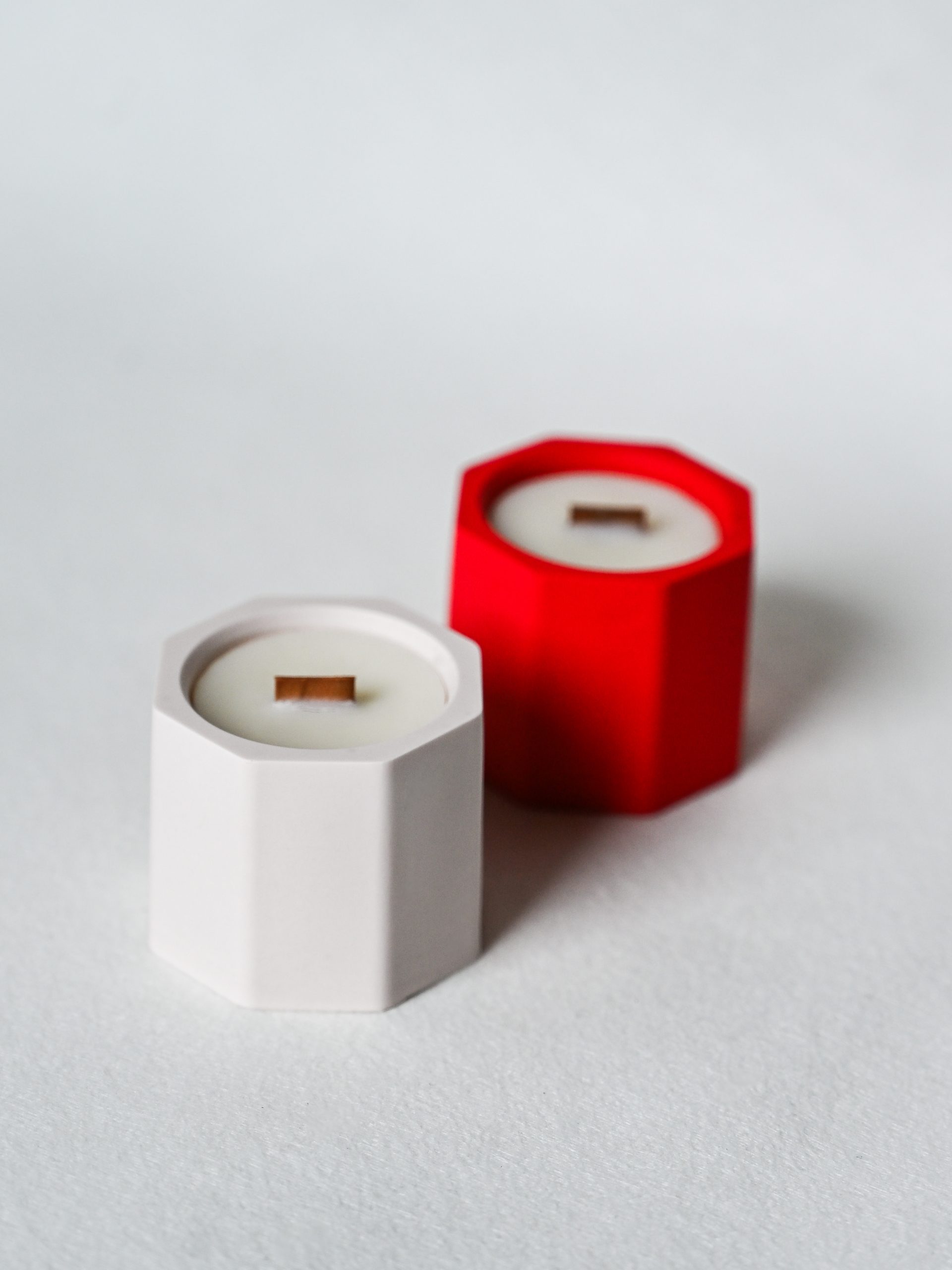 Soy wax, essential oils, gypsum, wooden wick, glitter (optional), pigment.